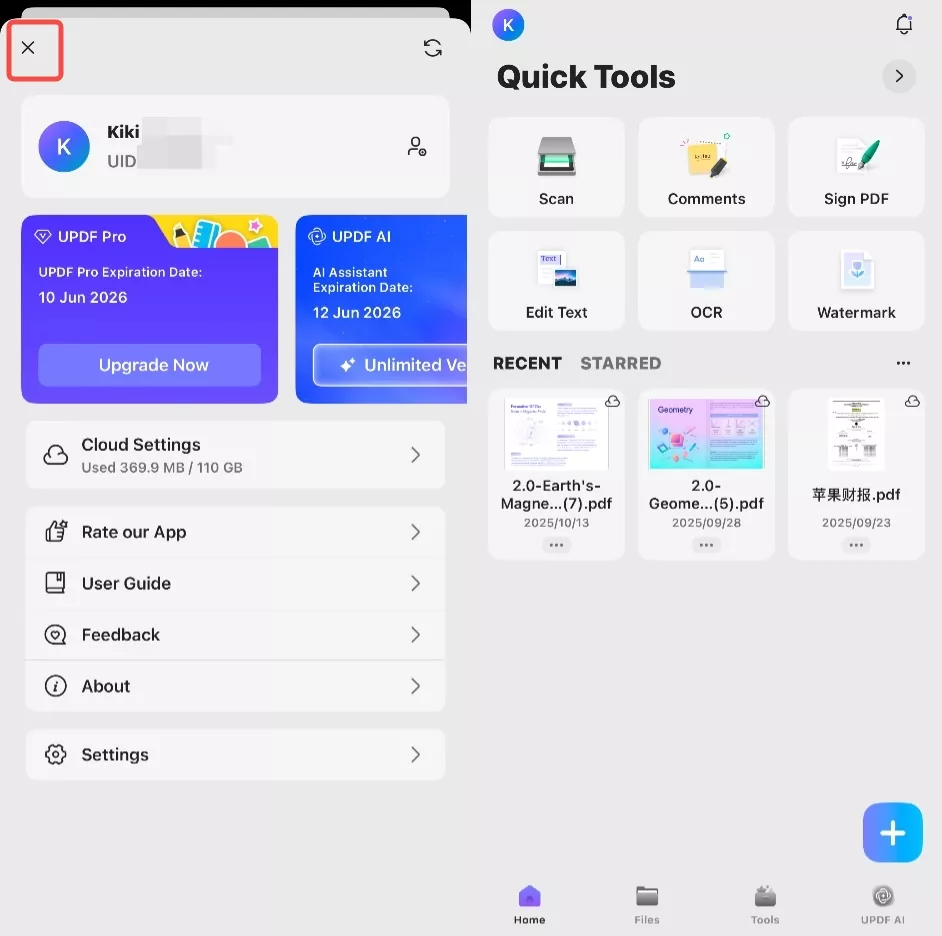 - After logging in to UPDF, you can view the status of your UPDF account, including whether the UPDF licenses you purchased are active. To start using UPDF to manage your documents, tap the close button in the upper left corner, and you will enter the main interface of UPDF for iOS.