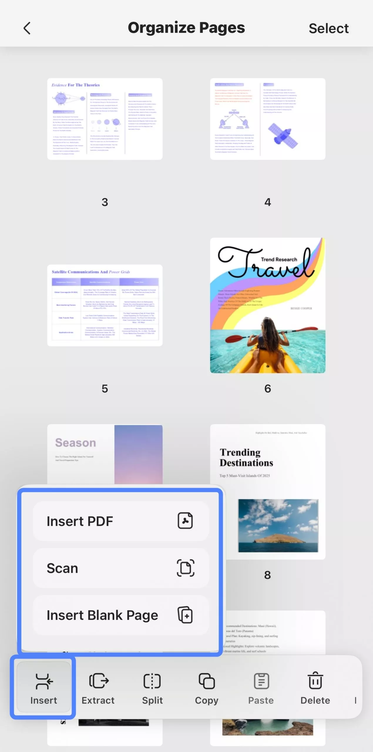 To insert pages into the opened PDF, tap on "Insert" on the bottom toolbar. UPDF provides three options: