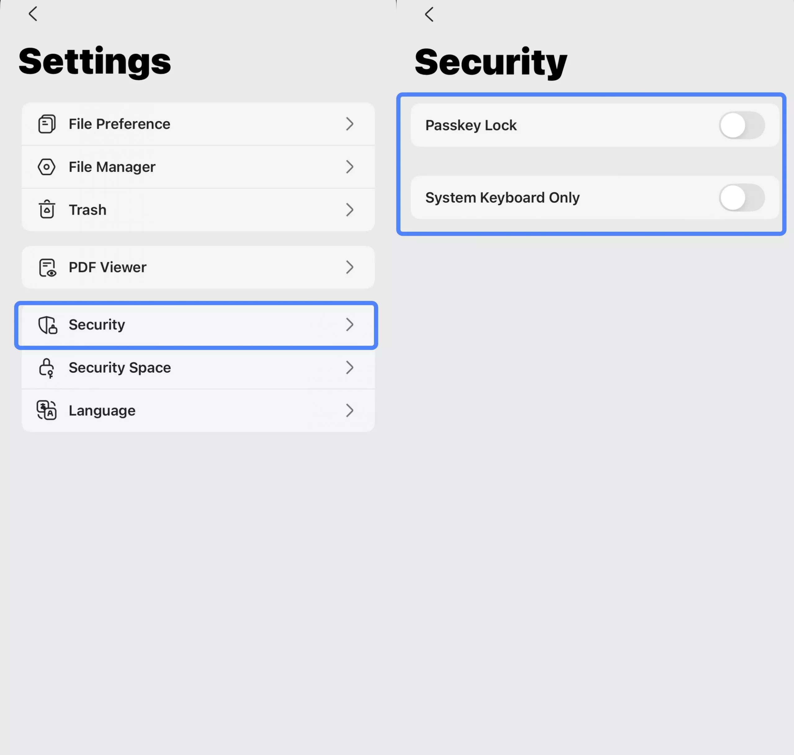 The Security menu presents two key options to protect your data. You can activate a "Passkey Lock" to secure access to the application or specific files, and you can enable "System Keyboard Only" to prevent potential security risks by ensuring only the device's trusted system keyboard is used for any typing.