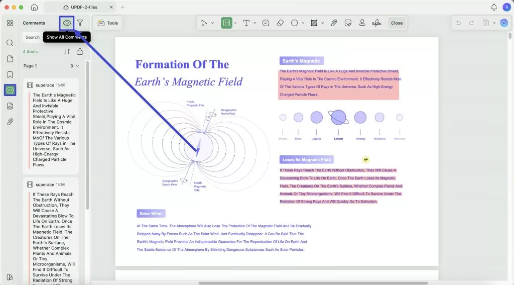 In some cases, you may not find the comments because you hide them unexpectedly. You can download UPDF via the button below and follow the guide below to unhide them. Please note this feature can only be found in the Mac version at the moment and will be supported soon on Windows.