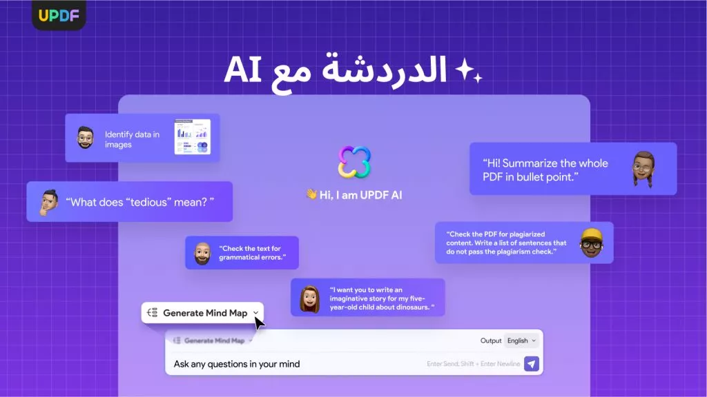 يُعتبر UPDF أحد الأدوات المتكاملة مع ChatGPT التي يمكن أن تعزز إنتاجية ملفات PDF بسرعة. يمتلك UPDF AI القدرة على إضفاء الحيوية على ملفات PDF المملة وتحليلها بشكل شامل. يمكنك أن تطلب من UPDF AI مساعدتك في تلخيص المحتوى بعد تحليل ملف PDF، ويساعدك أيضًا في تحليل الجداول للحصول على النتائج التي تحتاجها مباشرة. كما أنه يمكنه ترجمة نصوص PDF إلى لغات متعددة. إذا كنت لا تفهم أي شيء تقني أو معقد في PDF، يمكن لـ UPDF AI أيضًا شرح الأمور لك. يمكنك الاعتماد على هذه الأداة الذكية لكتابة محتوى أفضل وتوليد الأفكار.