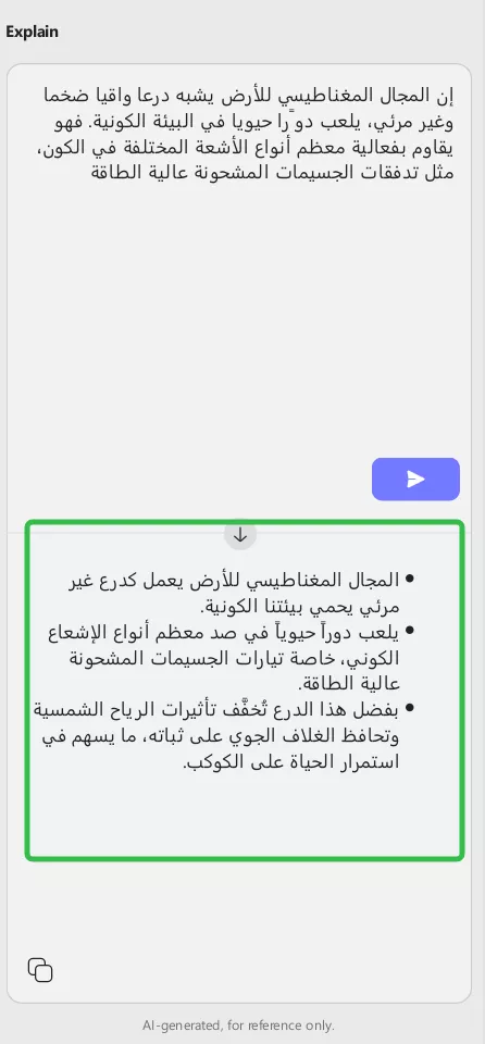 بعد لصق المحتوى، اكتب طلبًا يوجّه الذكاء الاصطناعي لشرح النص، ثم انقر على أيقونة إرسال. يمكنك أيضًا اختيار طلب الشرح (Explain) المدمج لإنجاز المهمة بسرعة. وبعد الحصول على الشرح، يمكنك إعادة إنشائه (Regenerate) أو نسخ المحتوى (Copy).