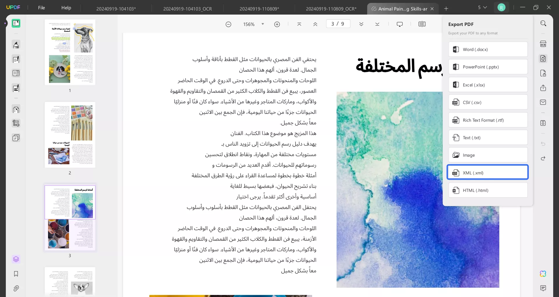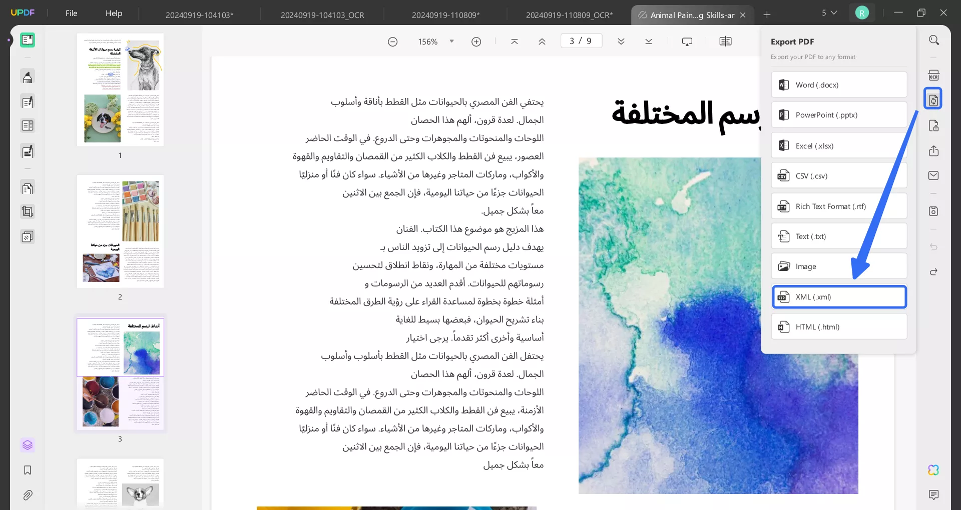 - سيفتح PDF جديد قابل للتعديل والبحث تلقائيًا في UPDF. الآن يمكنك تحويل هذا PDF إلى XML بالنقر على "تصدير PDF > XML > تصدير".