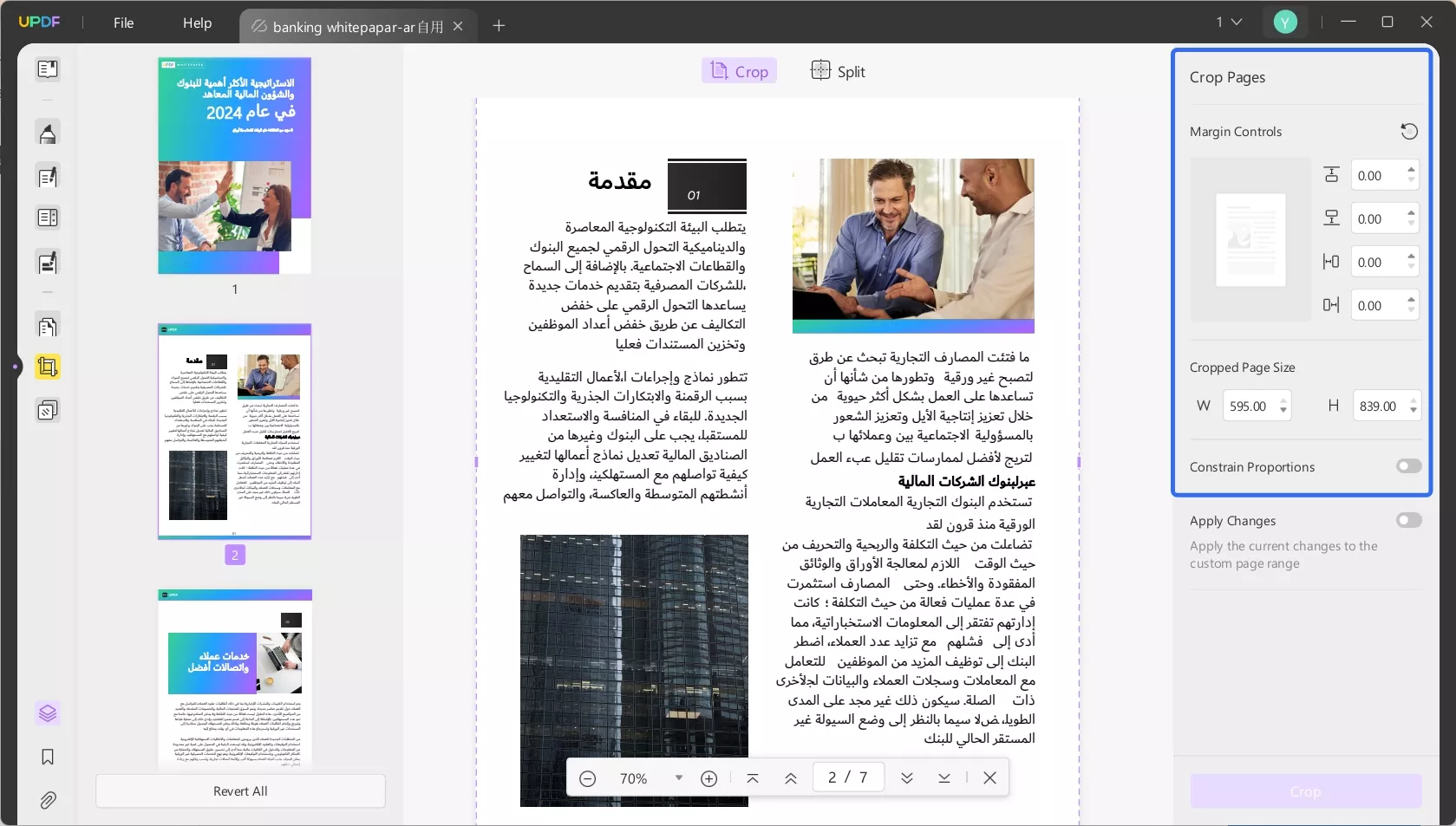 يمكنك الآن رؤية جميع أدوات اقتصاص صفحات PDF. يمكنك استخدام الفأرة لضبط مساحة الصفحة للاقتصاص.