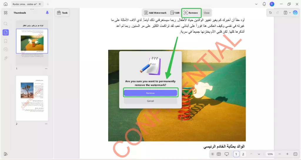في بعض الأحيان، تحتوي ملفات PDF على خلفيات كعلامات مائية لمنع النسخ أو التوزيع غير المصرح به. بمجرد إضافة علامة مائية خلفية، يمكنك أيضًا إزالتها باستخدام UPDF. حيث يمكنه اكتشاف العلامة المائية ثم يتيح لك إزالتها بنقرة واحدة.