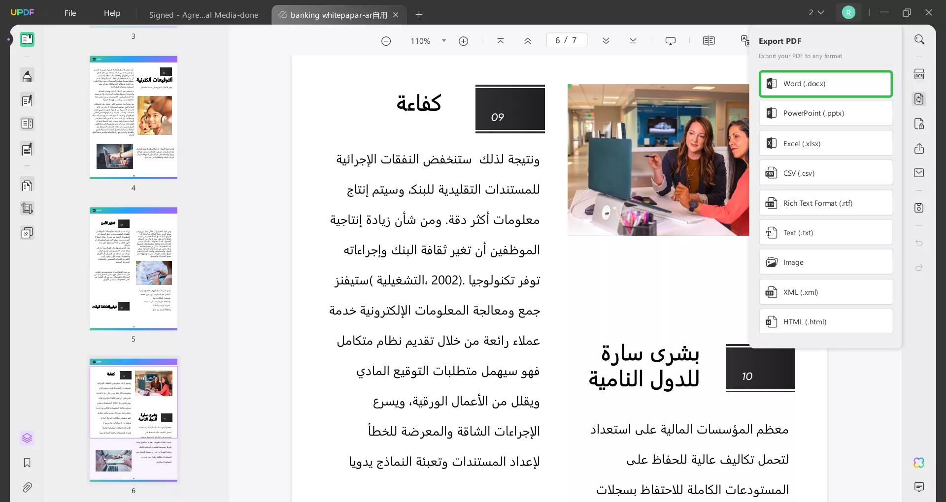 الخطوة 1: أولاً، سيحتاج المستخدمون إلى تحويل ملفات PDF الخاصة بهم إلى مستندات Word. قم بتحميل UPDF عبر الزر أدناه، وافتح ملف PDF في محرر UPDF PDF، وانقر على ”تصدير PDF“ في اللوحة اليمنى. الآن، اختر خيار ”Word (.docx)“ من القائمة وخصص الإعدادات. بعد ذلك، اضغط على زر ”تصدير“ وحدد مجلدًا واحفظ الملف.