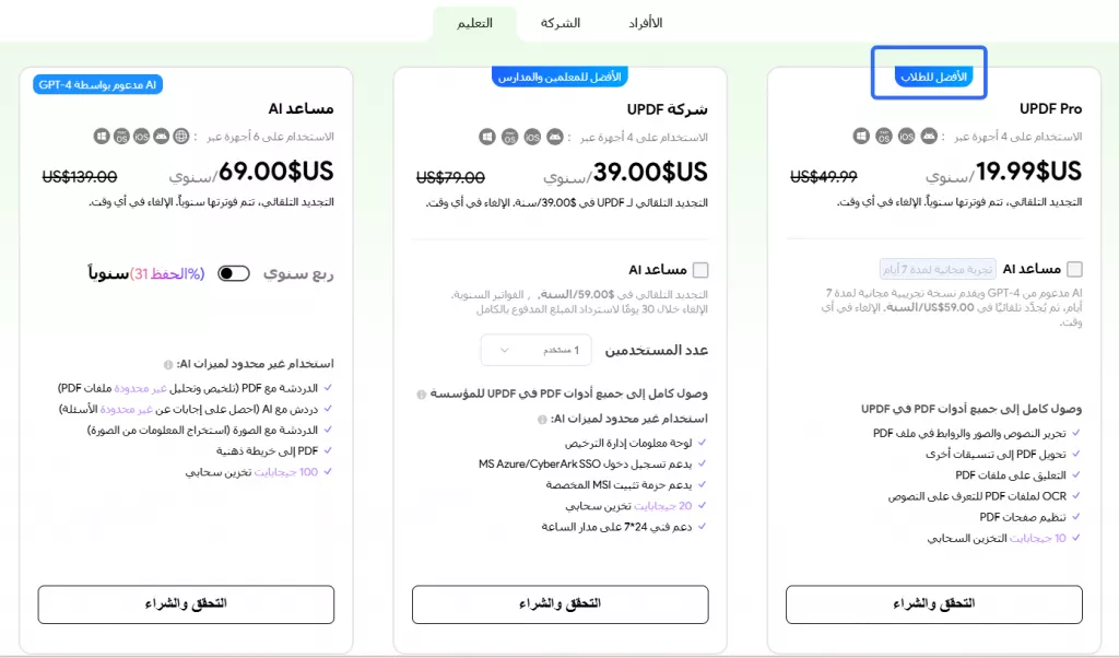 - قم بزيارة صفحة "التعليم" في قسم التسعير على موقع UPDF.