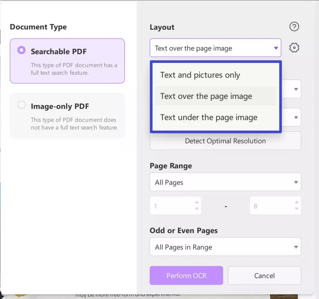تحديد إعدادات التخطيط: من إعدادات التخطيط، يمكنك اختيار "Text and pictures only/Text over the page image" (النصوص والصور فقط/النصوص فوق صورة الصفحة) والمزيد! بالنسبة إلى "Document Language" (لغة المستند)، يمكنك الاختيار من بين 38 لغة مختلفة، وتحديد "Image Resolution" (دقة الصورة) كما تفضل.