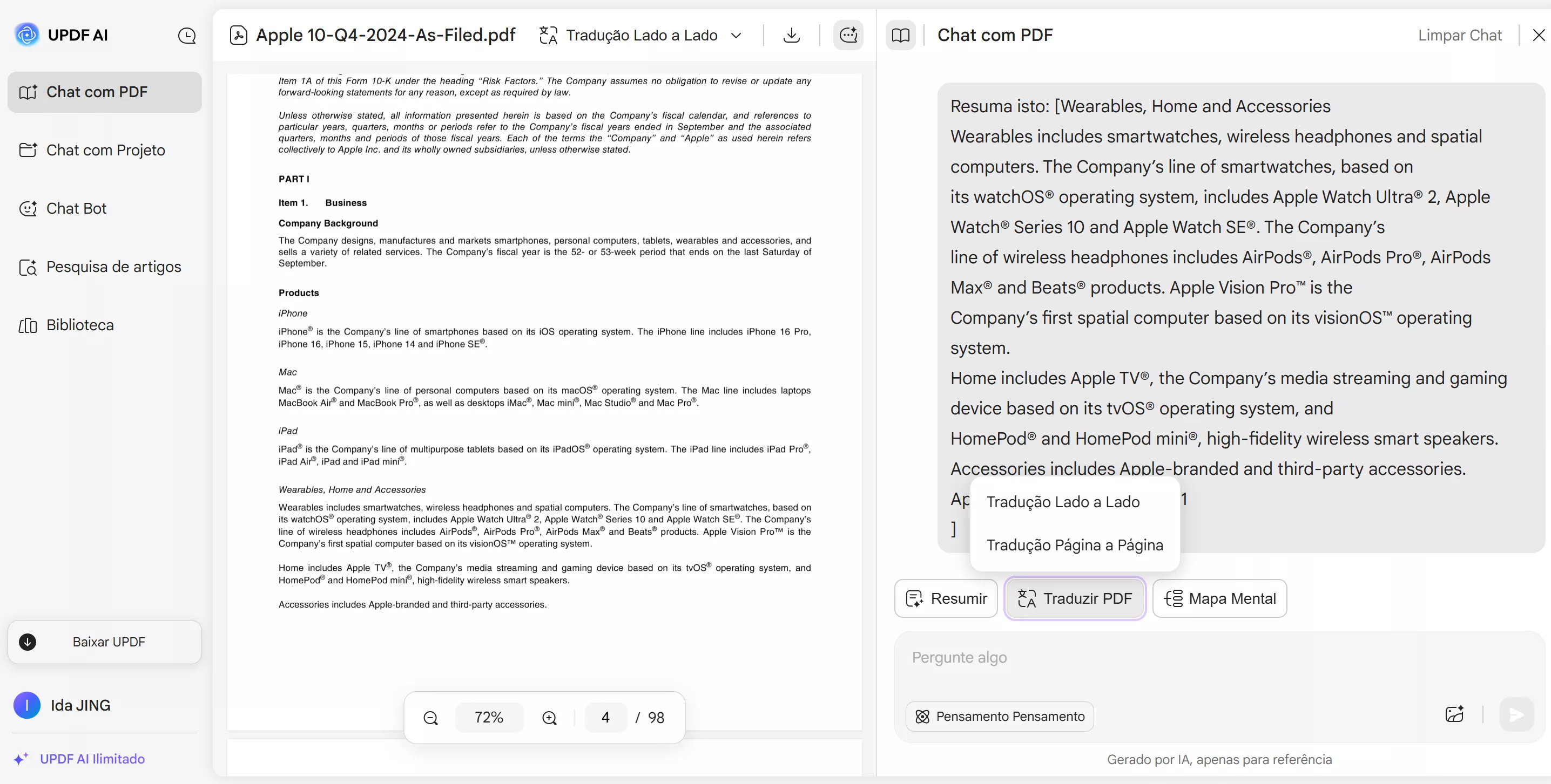 - Bate-papo com IA: Ele pode ter conversas diretas com você sobre qualquer tópico de sua escolha, dentro ou fora do escopo do PDF.