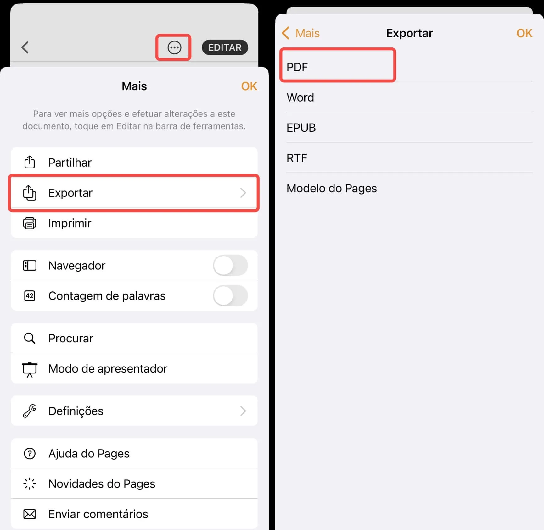 - Escolha ''Exportar'' e selecione ''PDF''.