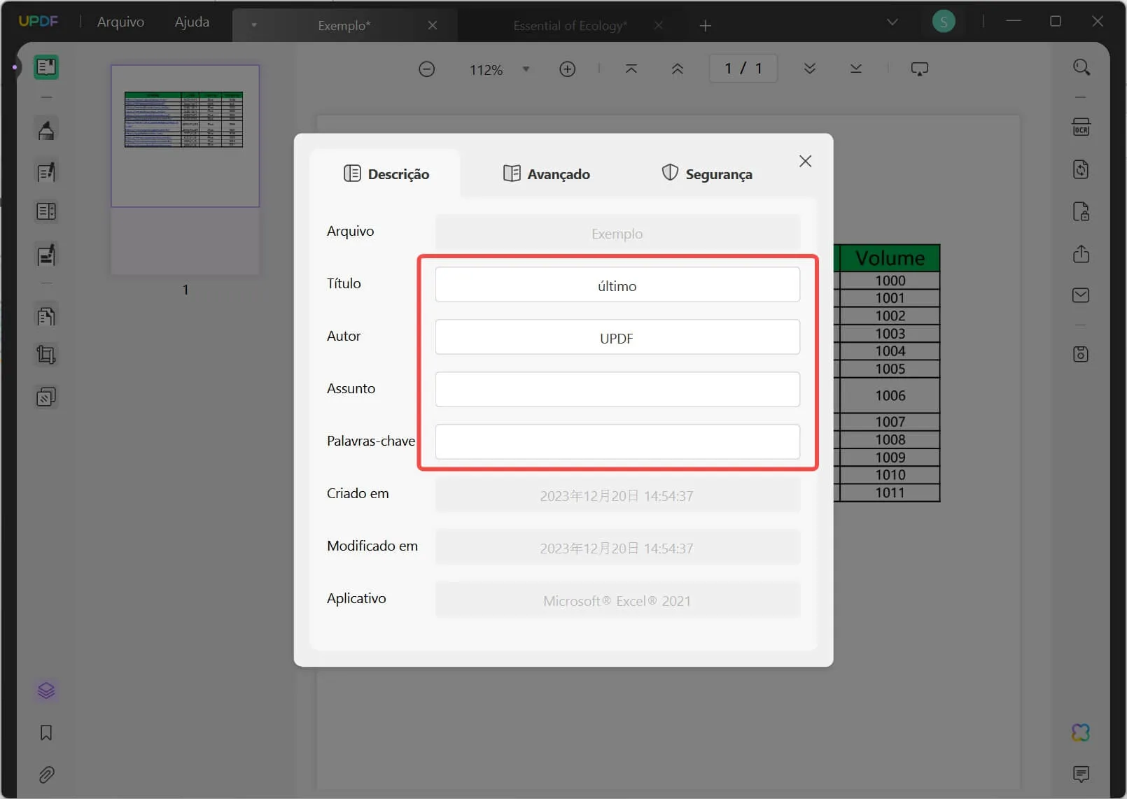 Após a abertura da janela, você poderá visualizar os detalhes de metadados, onde terá a liberdade de modificar os metadados dos arquivos PDF de acordo com suas necessidades individuais.