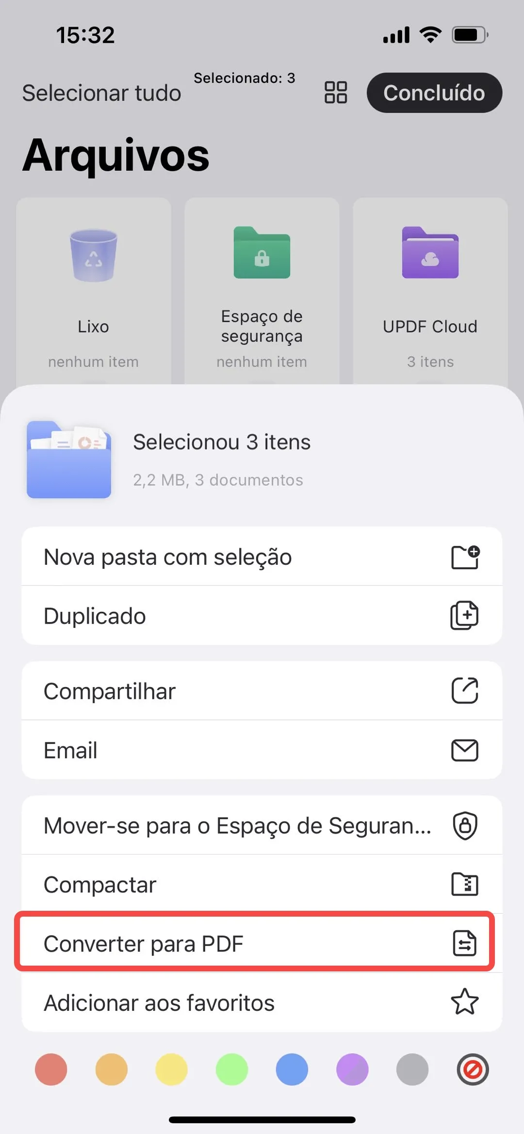 Após importar os arquivos PNG para o UPDF, encontre o ícone da "Caixa de Seleção" e toque nele para começar a selecionar os PNGs que você deseja converter em PDF. Na parte inferior da tela, toque no botão "Mais".