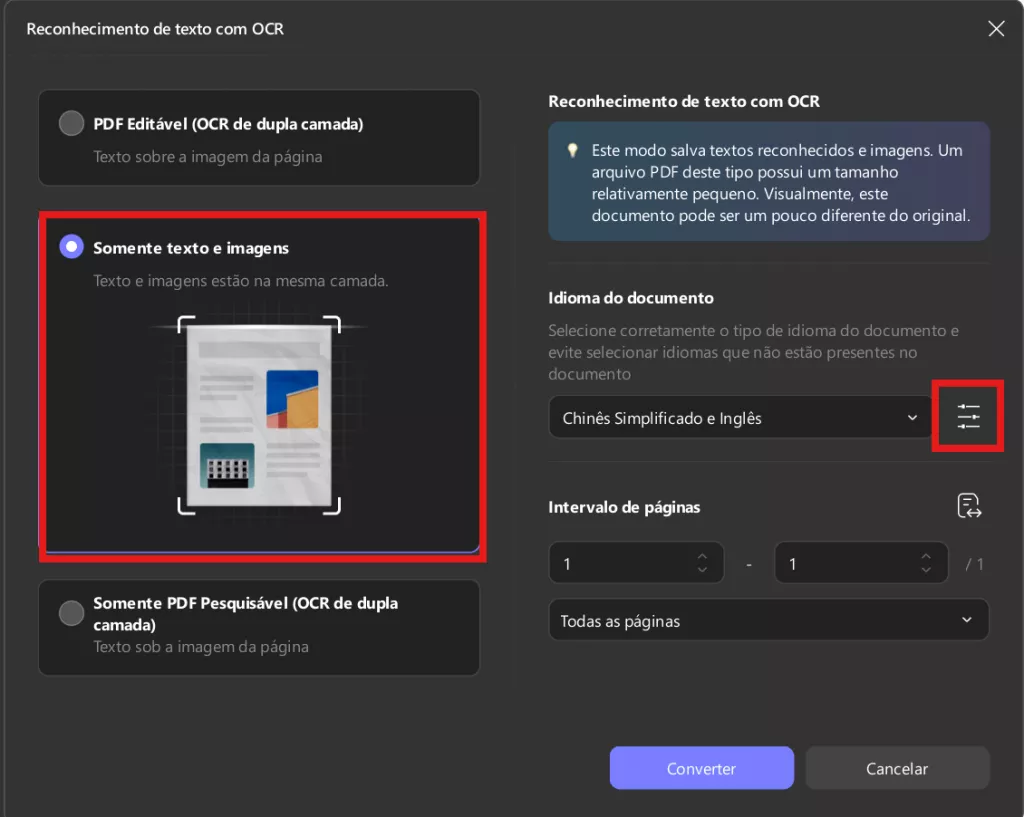 3. Na configuração do OCR, selecione "Somente texto e imagens". Isso fará com que seu PDF editável se transforme em um PDF não editável e somente de imagem.