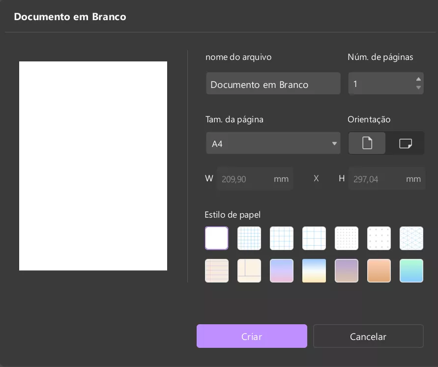 Passo 2: Defina o nome do arquivo, número de páginas, tamanho da página, estilo da página etc., e clique em "Criar".