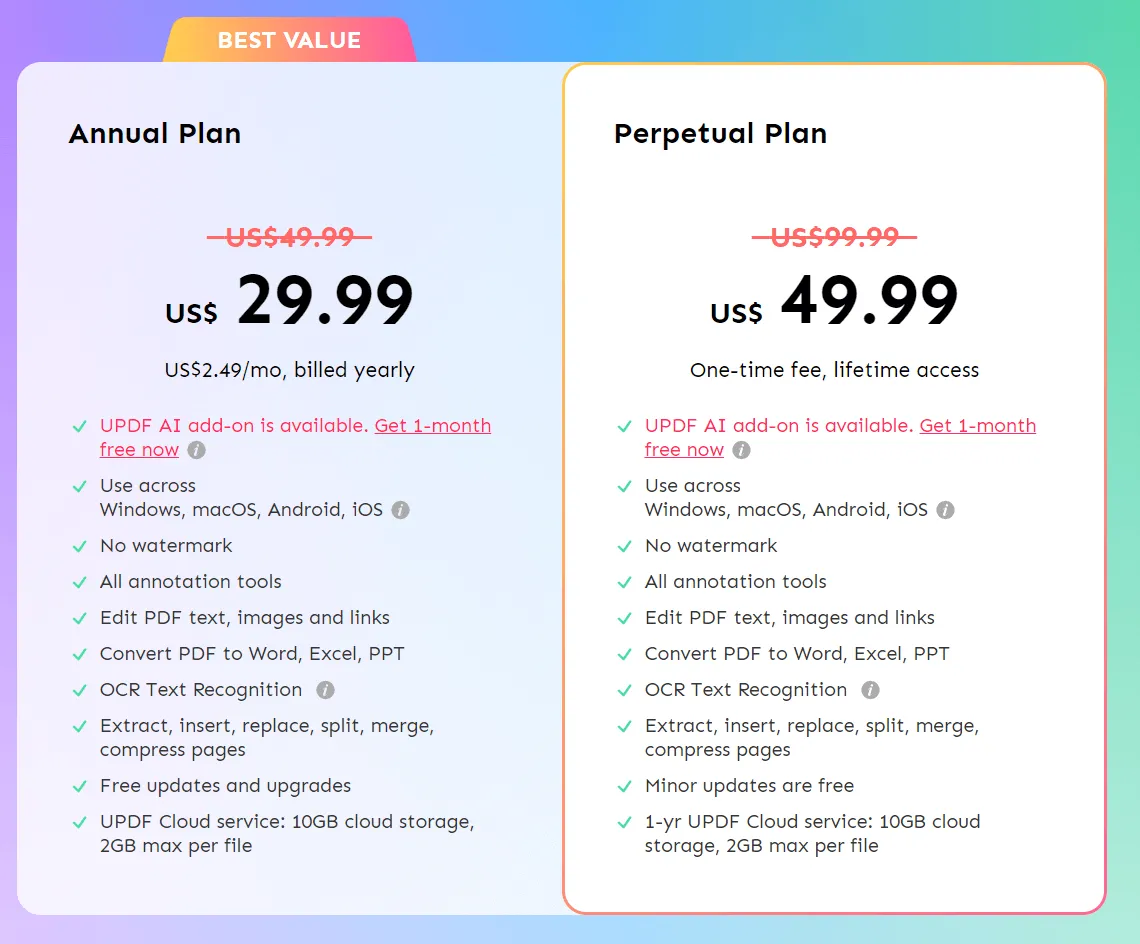 Comparatively, UPDF offers two pricing plans for its users, including annual and perpetual plans. The annual plan costs US$29.99, and the perpetual plan costs US$49.99, which is very economical. You can access and use a wide range of features of UPDF at such a great price, whereas you have to pay a fortune to use some basic features of Online PDF Converter. In short, UPDF is more cost-effective than Online PDF Converter.