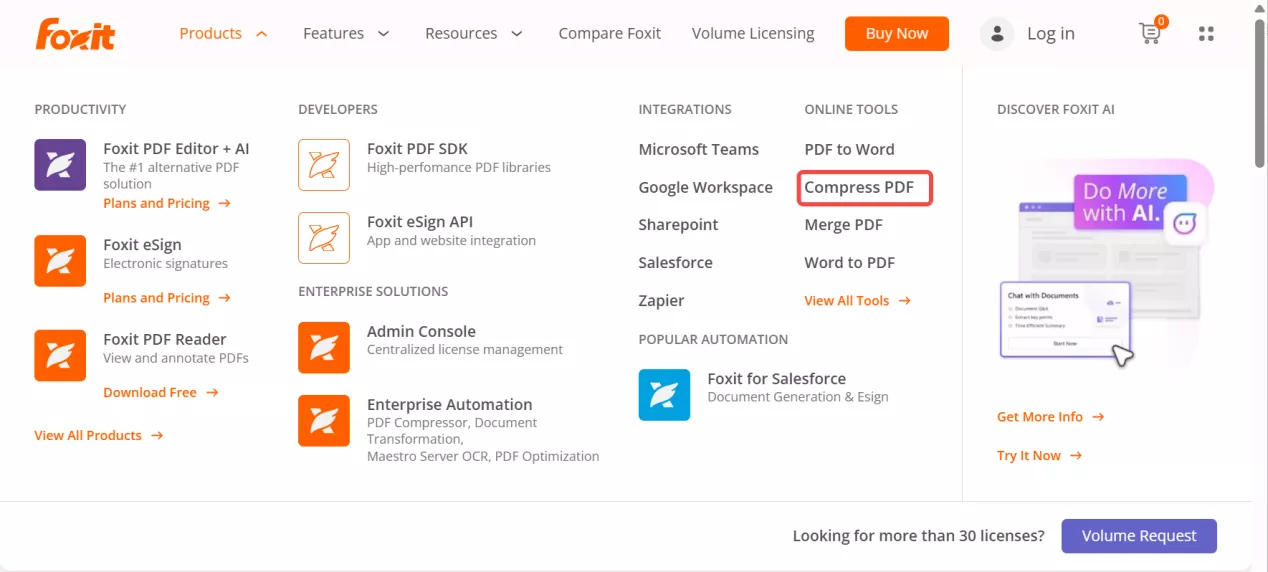 Step 1. Open Foxit Online on any of your web browsers and hover over the "Products" option on the toolbar. It will show you various PDF editing tools. After that, click on the "Compress PDF" option under the "ONLINE TOOLS" section to access a new window.