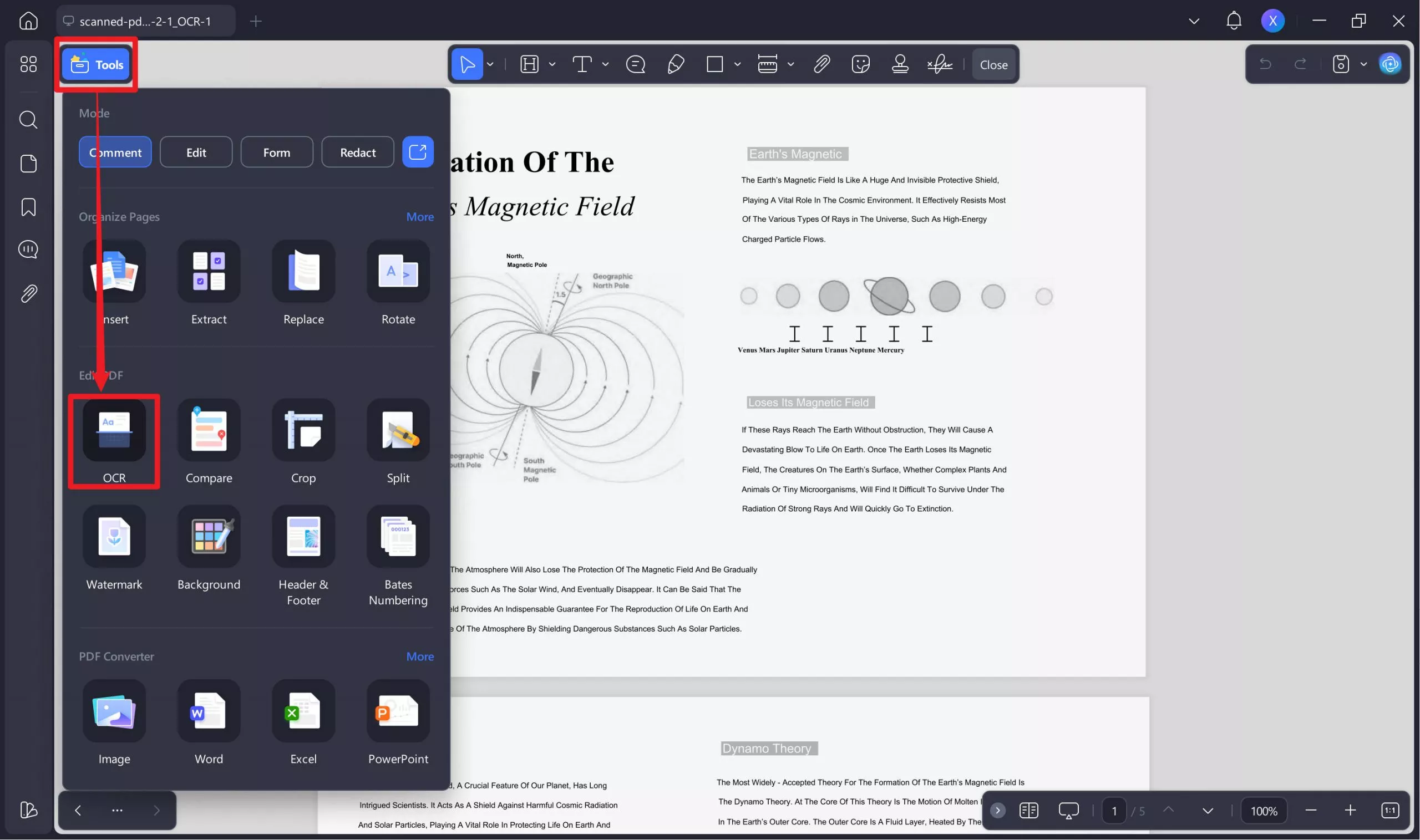 First, upload the scanned PDFs or images on UPDF to convert them to Word format. Once the scanned PDF is uploaded, hit the "OCR" in "Tools" icon to access the conversion settings pop-up window.