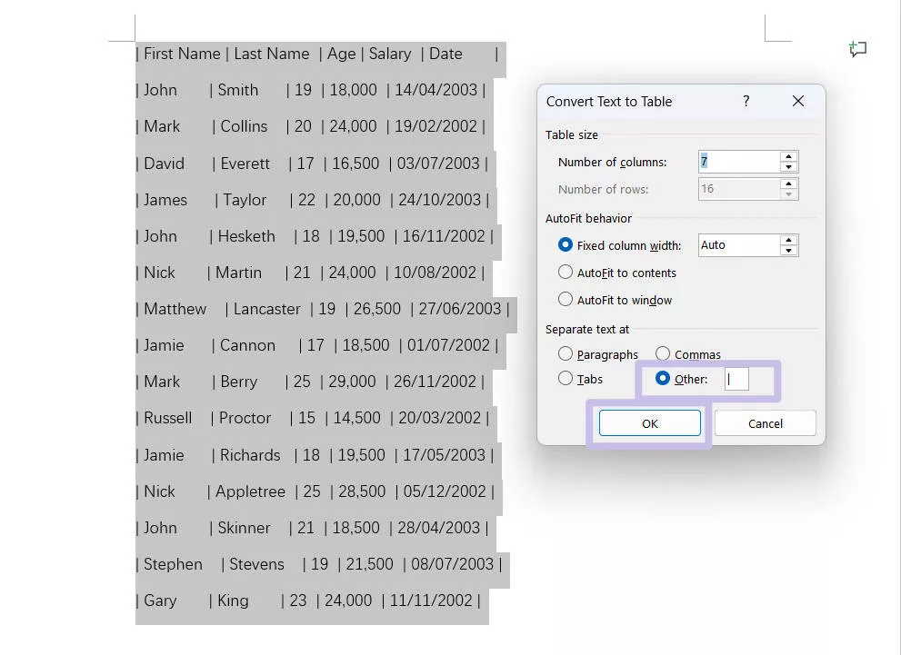 Step 5. Since the table content copied from AI is divided by the "|" symbol, in the "Separate text at" field, select "Other" and enter "|". Word will automatically calculate the table size, i.e., number of columns and number of rows. Once done, click "OK".