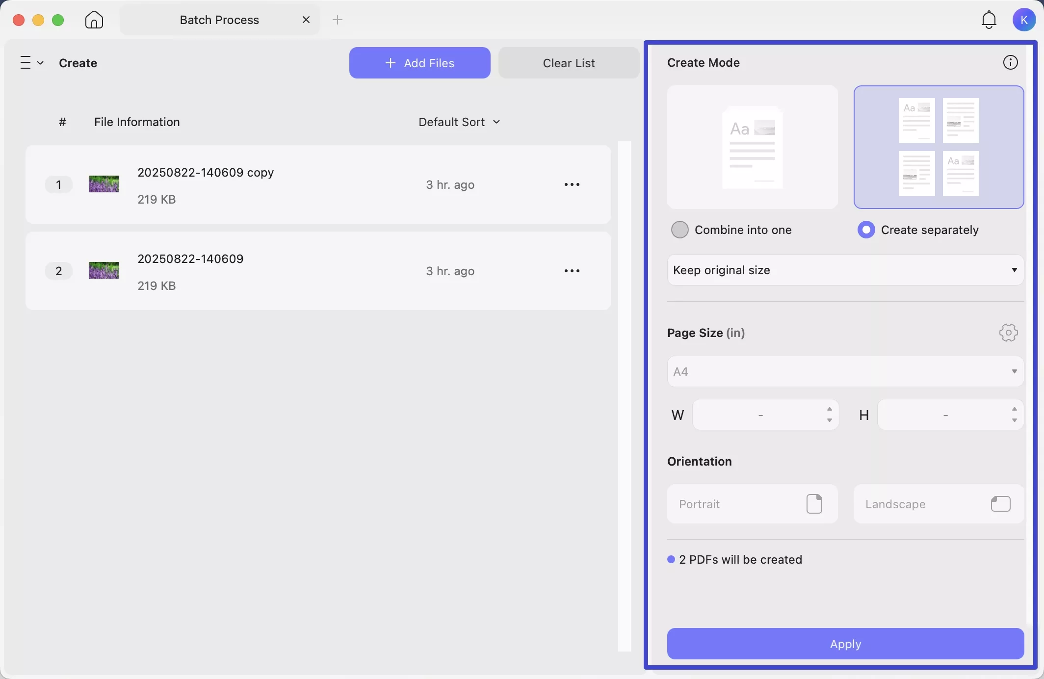 Step 3. Following that, you can choose "Combine into one" to merge all selected files into a single PDF or "Create separately" to generate individual PDFs for each file. Below that, you can choose "Keep original size" to retain the original dimensions of the files or choose "Standardize page size" to customize the width (W) and height (H). The "Orientation" section provides options to set the page layout as either "Portrait" or "Landscape" for the output PDFs.