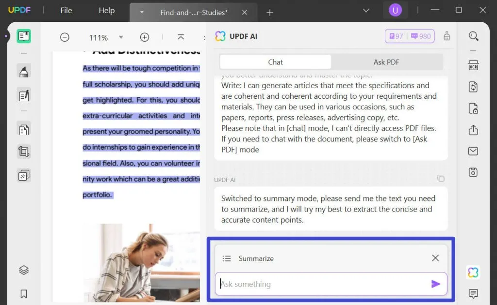 2. Klicken Sie auf die Registerkarte Chat in der Seitenleiste von UPDF AI. Sehen Sie die Option Zusammenfassen in der Dropdown-Liste direkt über dem Chat-Feld. Bitte tippen Sie darauf.