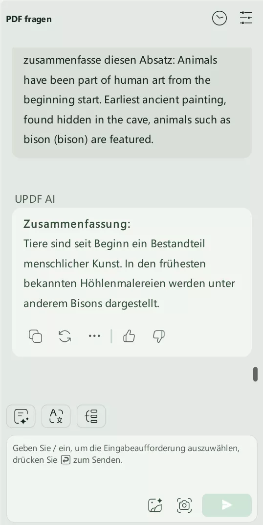Mit der Übersetzungsfunktion können Sie PDF-Text schnell in eine andere Sprache umwandeln. Kopieren Sie einfach den Text und fügen Sie ihn ein oder geben Sie ihn in den Modi „PDF fragen“ oder „Chat“ ein und fordern Sie eine Übersetzung an.