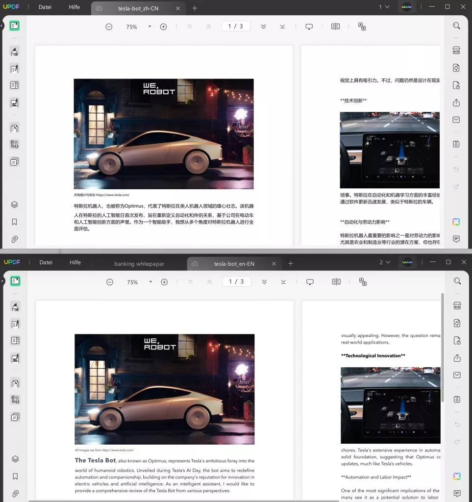UPDF ist ein leistungsstarkes Sprachübersetzungswerkzeug, das mit KI erweitert wurde, um nahtlose und effiziente Übersetzungen zu liefern. Es ermöglicht Ihnen, PDFs ins Deutsche zu übersetzen und dabei das ursprüngliche Layout beizubehalten. So entsteht ein neues PDF, das sich perfekt zum Überprüfen und Vergleichen der Übersetzungsergebnisse eignet.