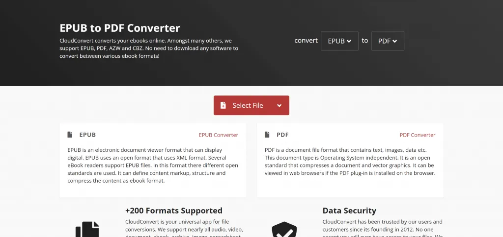 Cloudconvert ist einer der beliebtesten Konverter für EPUB- in PDF-Dateien, der Sie Ihre Dateien blitzschnell von einem Format in ein anderes umwandeln lässt. Mit Cloudconvert können Sie Ihre Dateien in gängige Dateiformate wie EPUB, PDF, AZW und CDZ umwandeln und brauchen dafür keinerlei Software auf Ihrem Gerät.