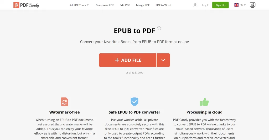 PDFcandy ist ein weiteres kostenloses Top-Online-Tool, mit dem Sie eine EPUB-Datei mühelos in das PDF-Format umwandeln können. Wie die meisten bereits besprochenen Tools unterstützt auch PDFcandy verschiedene andere Formate wie DOC, RTF, TXT, ODT und HTML, was es zu einem vielseitigen Tool für die Dateikonvertierung macht.