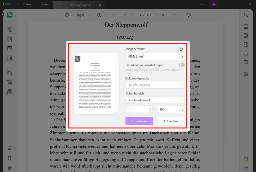 • Schritt 2: In dem Pop-up-Fenster kannst du bei Bedarf den Seitenbereich auswählen und dann auf die Schaltfläche „Exportieren“ klicken.