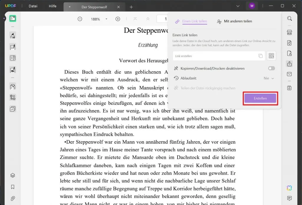 Jetzt kannst du auf die Schaltfläche „Erstellen“ klicken, um einen Link für deine PDF-Datei zu erstellen.