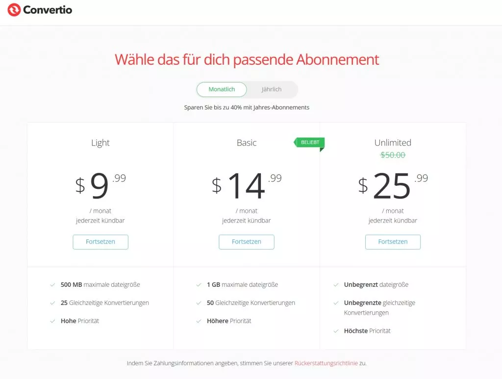 Convertio bietet drei Abonnementpläne mit monatlichen und jährlichen Preisoptionen. Im Folgenden finden Sie einen detaillierten Vergleich der Funktionen.