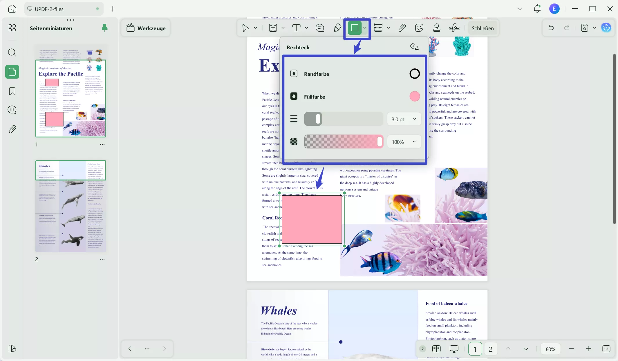 Gehen Sie zu „Werkzeuge“ > „Kommentar“ > „Rechteck“. Nachdem Sie das Rechteck-Werkzeug ausgewählt haben, bewegen Sie den Mauszeiger darüber, um die Rahmen- und Fülleinstellungen anzupassen. Stellen Sie die Füllfarbe auf Weiß (oder passend zur Hintergrundfarbe) und die Deckkraft auf 100 % ein . Zeichnen Sie anschließend das Rechteck über die Seitenzahlen, um sie auszublenden.