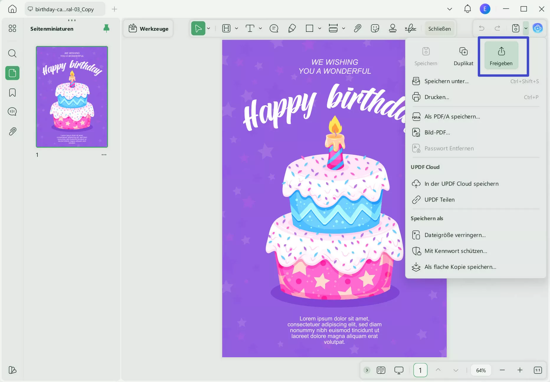 Sobald die PDF-Datei in UPDF geöffnet ist, müssen Sie auf der rechten Seite des Fensters die Schaltfläche „Freigeben“ finden. Klicken Sie sie an.