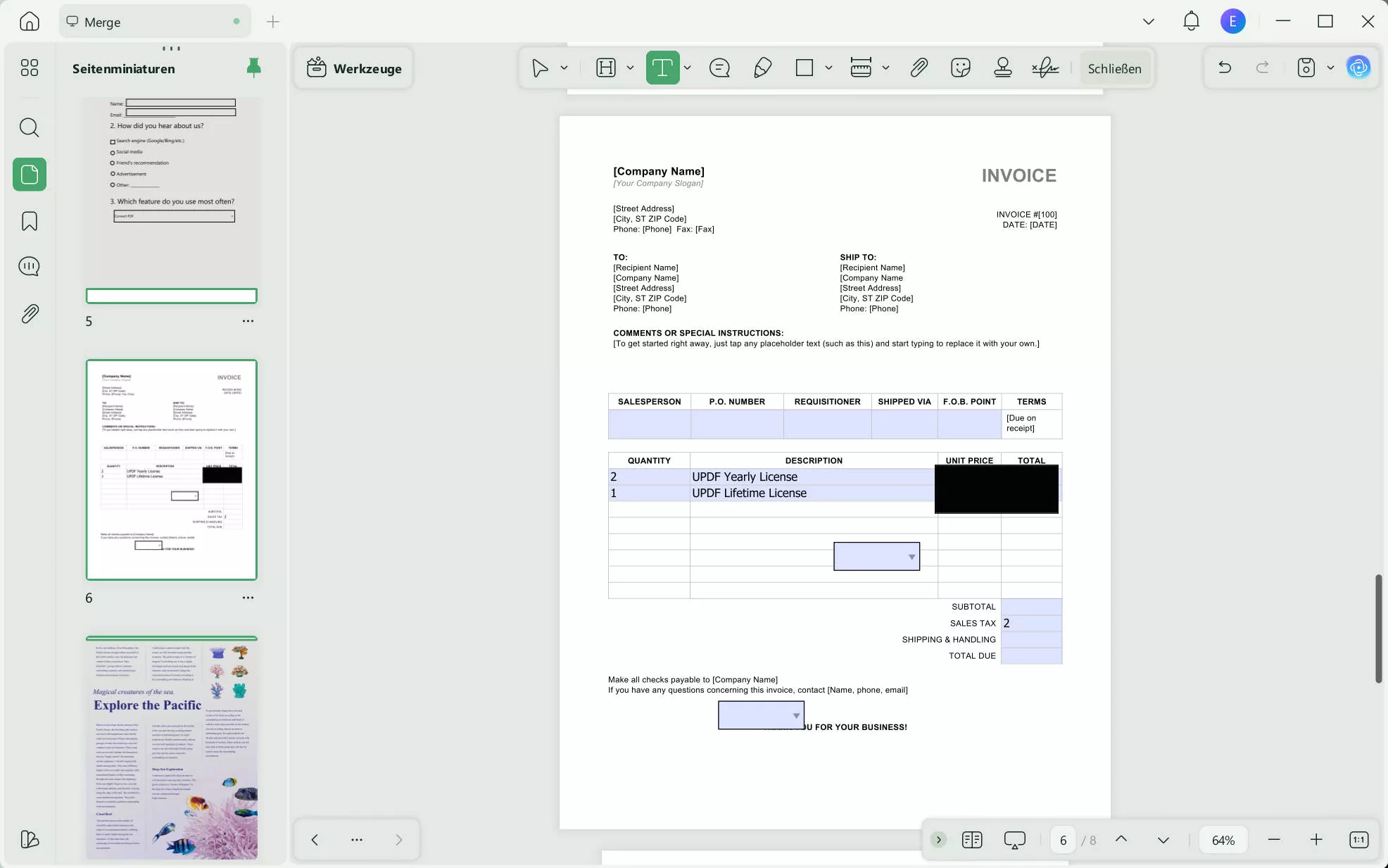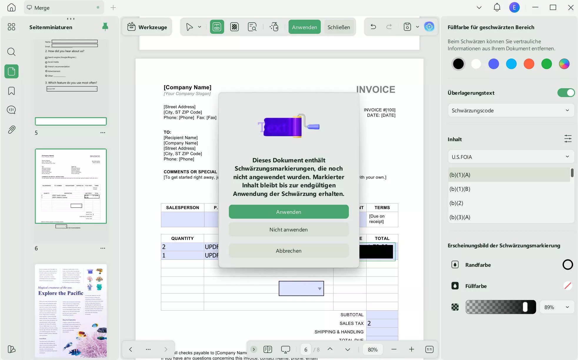 Das war's auch schon! Denken Sie jedoch daran, dass es sich hierbei um keine echte Schwärzung handelt, da die Formen leicht wieder aus der Datei entfernt werden können. Für den vollständigen Schutz Ihrer Kontoauszugsdaten ist diese Methode also nicht zu empfehlen.