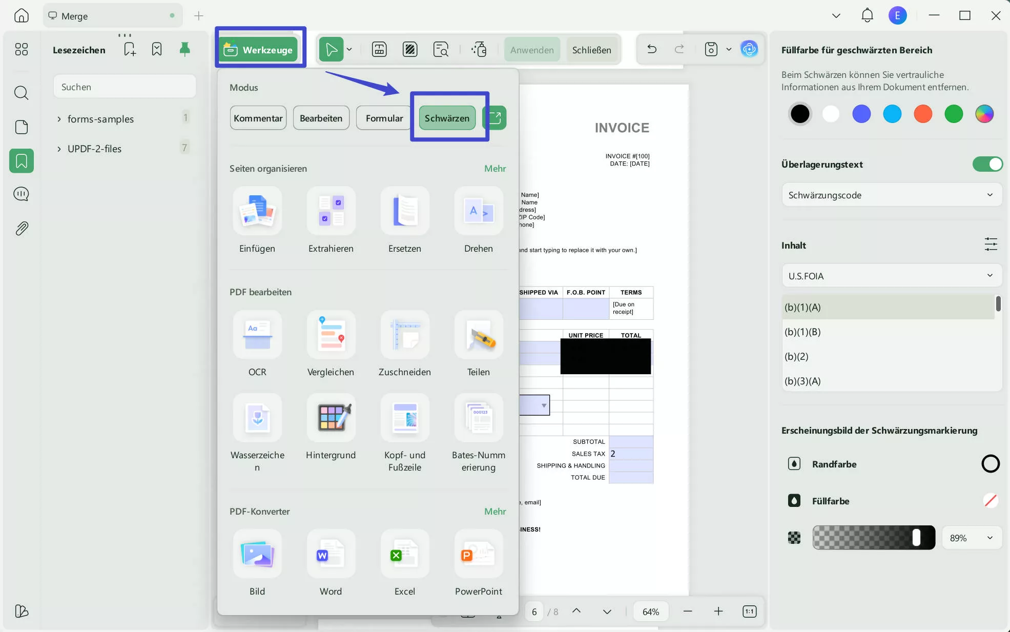 Dank seines Benutzerfreundlichkeit ist es mit UPDF keine große Sache, Ihre Kontoauszüge sofort und einfach zu bearbeiten und zu schwärzen. Dabei stehen Ihnen sogar zwei Möglichkeiten zur Verfügung – Sie können Ihre Kontoauszüge entweder dauerhaft oder vorübergehend schwärzen.