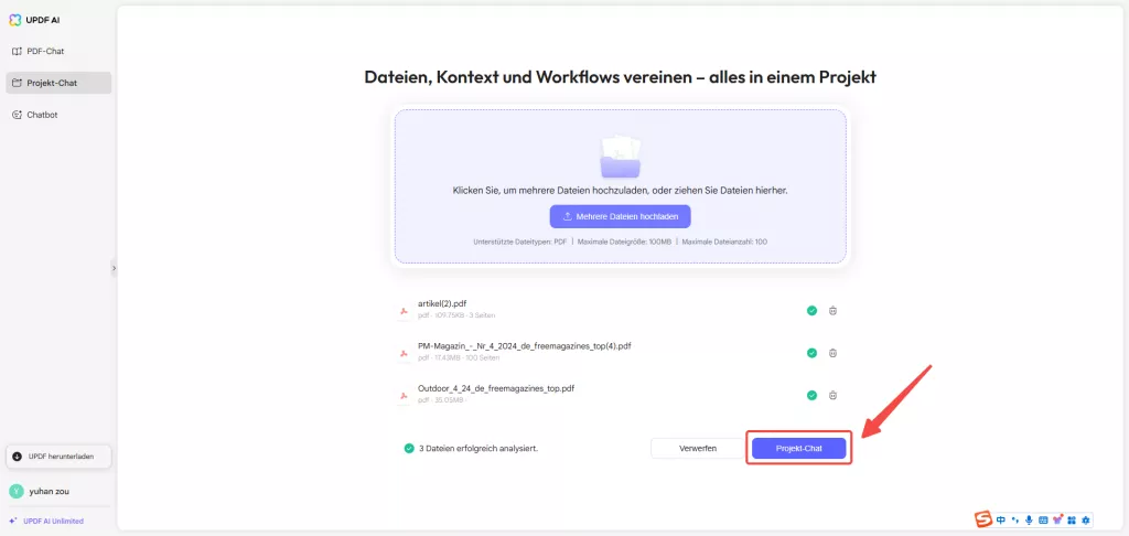 Sobald Ihre mehreren PDFs hochgeladen sind, klicken Sie auf die Schaltfläche „Projekt-Chat“, um zur nächsten Benutzeroberfläche zu wechseln.