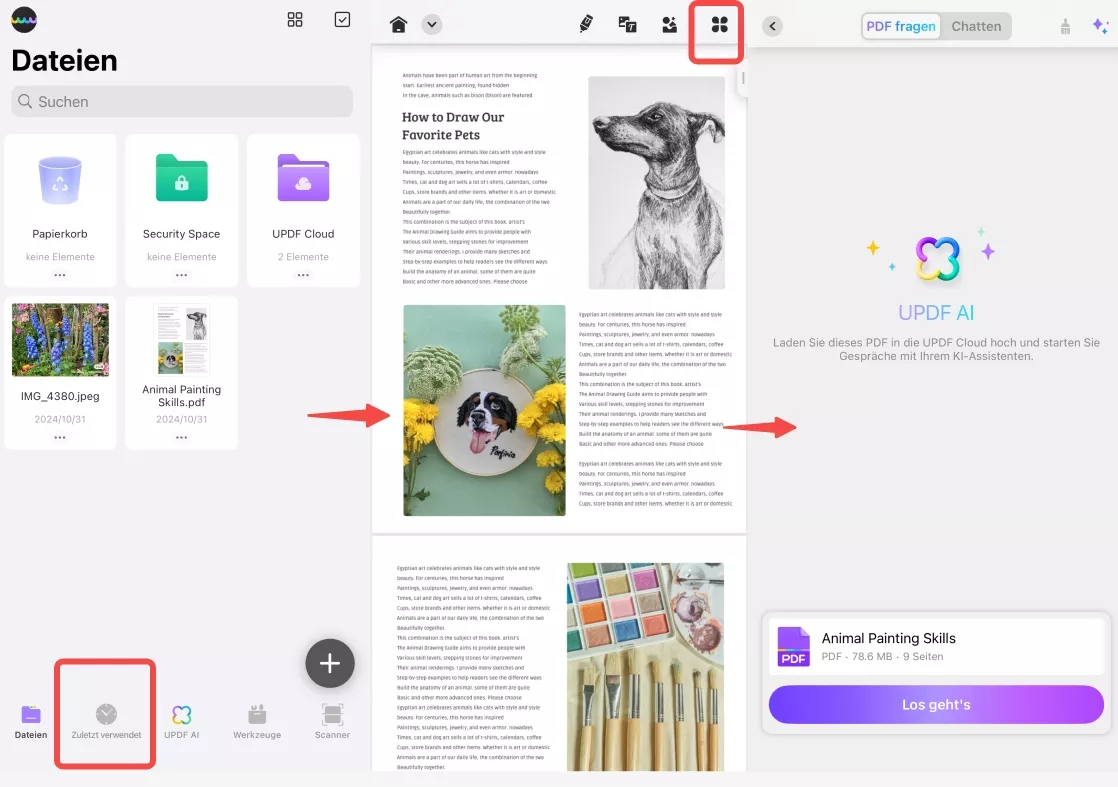 Wählen Sie die gewünschte PDF-Datei aus, indem Sie auf die Schaltfläche „Zuletzt verwendet“ tippen. Drücken Sie anschließend auf das Symbol „UPDF AI“ in der oberen rechten Ecke des Bildschirms, um die zusammengefasste Version aufzurufen.