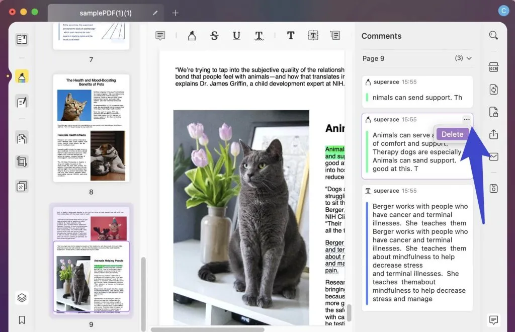 Öffnen Sie die Datei in Adobe Acrobat und gehen Sie auf „Kommentar“ in der rechten Symbolleiste. Halten Sie im Abschnitt „Kommentar“ die „Befehlstaste“ gedrückt und wählen Sie alle Seiten aus, die markierten Text enthalten. Nachdem Sie alle Seiten ausgewählt haben, klicken Sie mit der rechten Maustaste auf sie und wählen Sie „Löschen“.