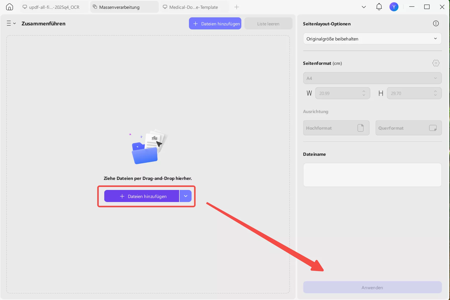 Mit UPDF lassen sich mehrere PDF-Dateien ganz einfach zu einem einzigen Dokument zusammenführen. Dateien hinzufügen und zusammenführen – mehr ist nicht nötig. So können Sie zahlreiche Dateien einfacher verwalten und überprüfen. Im Folgenden finden Sie eine detaillierte Anleitung zum Zusammenführen von PDFs: