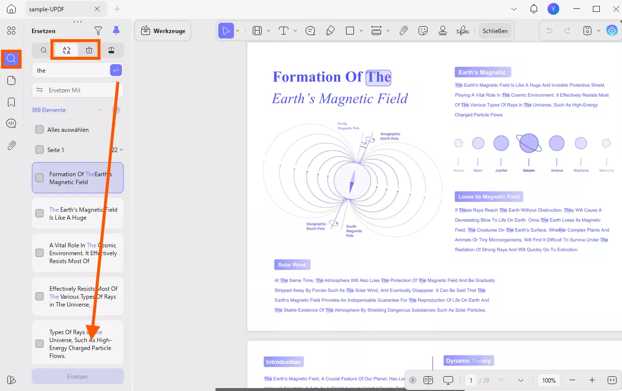 Sie können Schlüsselbegriffe in einzelnen Abschnitten oder im gesamten Dokument suchen, ersetzen oder löschen. Öffnen Sie Ihre PDF-Datei in UPDF und klicken Sie links auf „Suchen“. Wählen Sie die Option „löschen“ oder „ersetzen“.