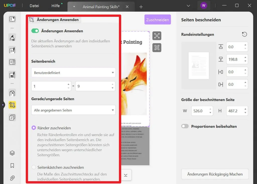 - Wenn das PDF geladen ist, wählen Sie „Zuschneiden“ und zeichnen Sie den Zuschneidebereich.