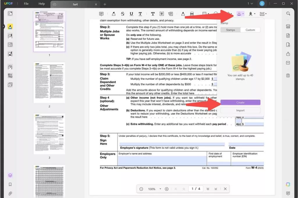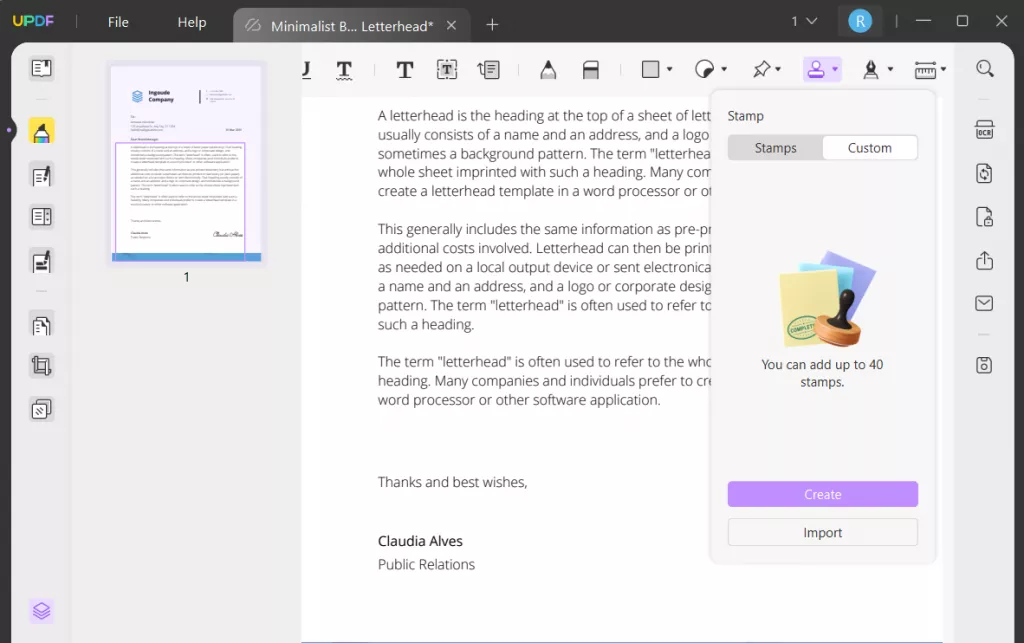 Öffnen Sie das PDF in UPDF und wählen Sie auf der linken Seite „Kommentieren“. Wählen Sie aus den Tools oben das Stempeltool aus und wählen Sie „Benutzerdefiniert“ > „Erstellen“.
