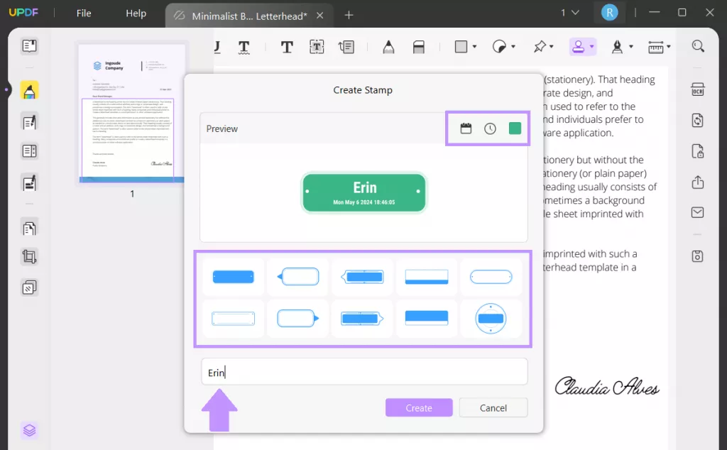 Jetzt können Sie die Einstellungen wie Stil für Ihren Signaturstempel anpassen auswählen und den Namen eingeben. Wählen Sie oben rechts die gewünschte Datumsformat und Zeitformat. Oder fügen Sie eine benutzerdefinierte Farbe für Ihren Stempel hinzu. Wenn Sie fertig sind, klicken Sie auf „Erstellen“.