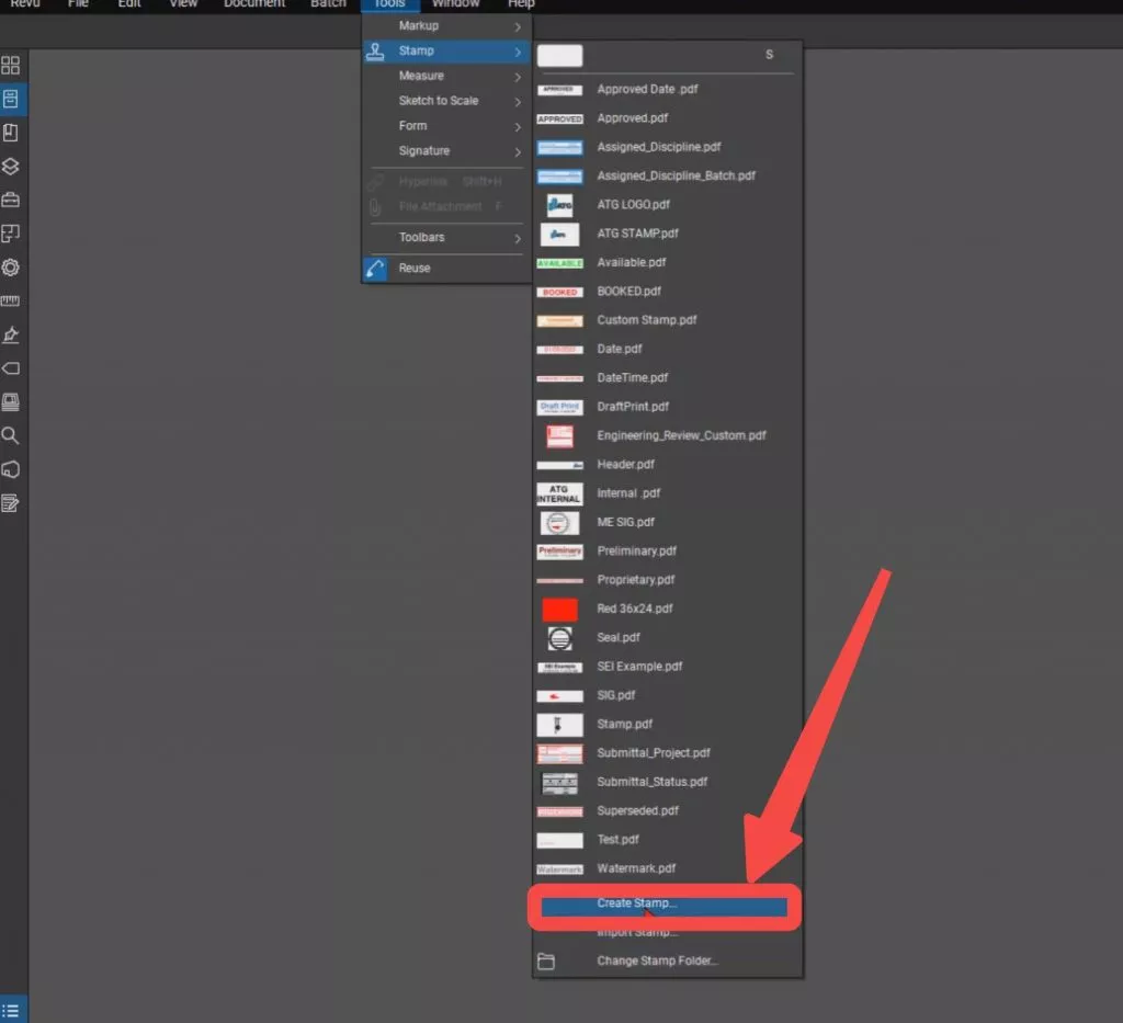Öffnen Sie Bluebeam Revu und laden Sie das PDF hoch, dem Sie einen Signaturstempel hinzufügen möchten. Wählen Sie im Menü oben „Tools“ > „Stempel“.