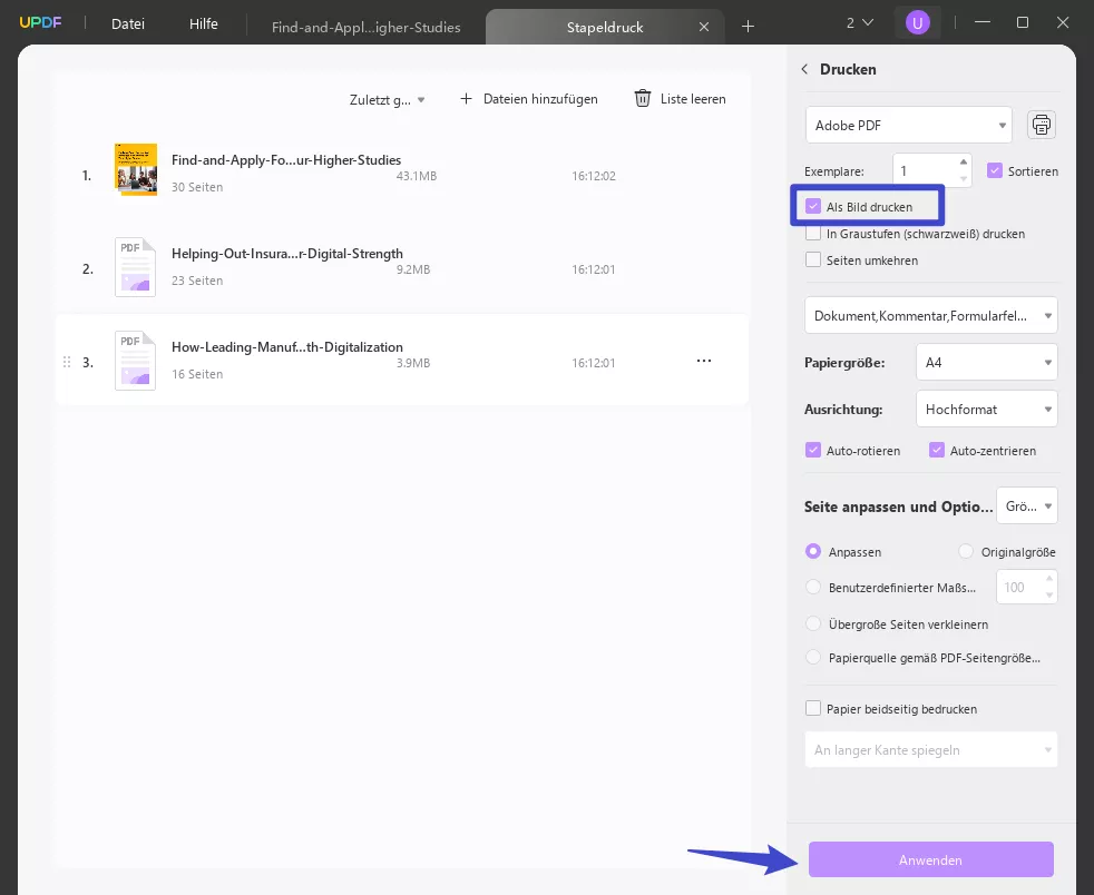 Anleitung : Öffnen Sie UPDF und klicken Sie auf „Stapel“ > „Drucken“. Dann klicken Sie auf „Dateien hinzufügen“, um alle PDF-Dateien hinzuzufügen, die Sie als Bilder drucken möchten. Wählen Sie „Als Bild drucken“ und klicken Sie auf „Übernehmen“, um den Ort auszuwählen, an dem Sie die gedruckten Dokumente speichern möchten.