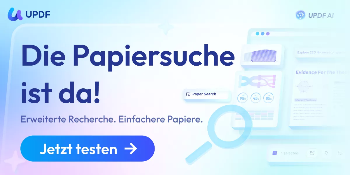 UPDF AI Papiersuche ist ein forschungsorientiertes Tool, das die Suche und das Verständnis wissenschaftlicher Literatur vereinfacht. Es durchsucht über 220 Millionen Publikationen und hilft Ihnen, schnell relevante Artikel zu finden, darunter Fachartikel und Patente. Mit nur einer Suche erhalten Sie detaillierte Metadaten wie Autoren, Publikationsjahr, Zitationen und Fachgebiete sowie prägnante, KI-generierte Zusammenfassungen, die die wichtigsten Ergebnisse hervorheben.