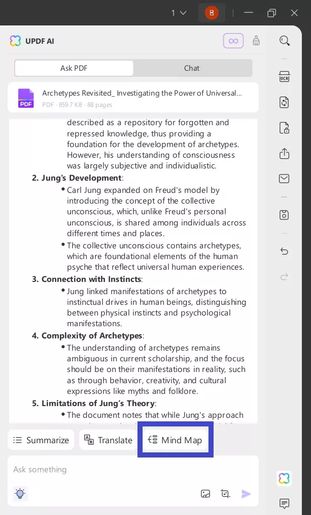 الخطوة 1. افتح ملف PDF في UPDF، وقم بتنشيط UPDF AI من الزاوية اليمنى السفلية، وانقر على زر ”Mind Map“ الموجود أعلى مربع الدردشة.