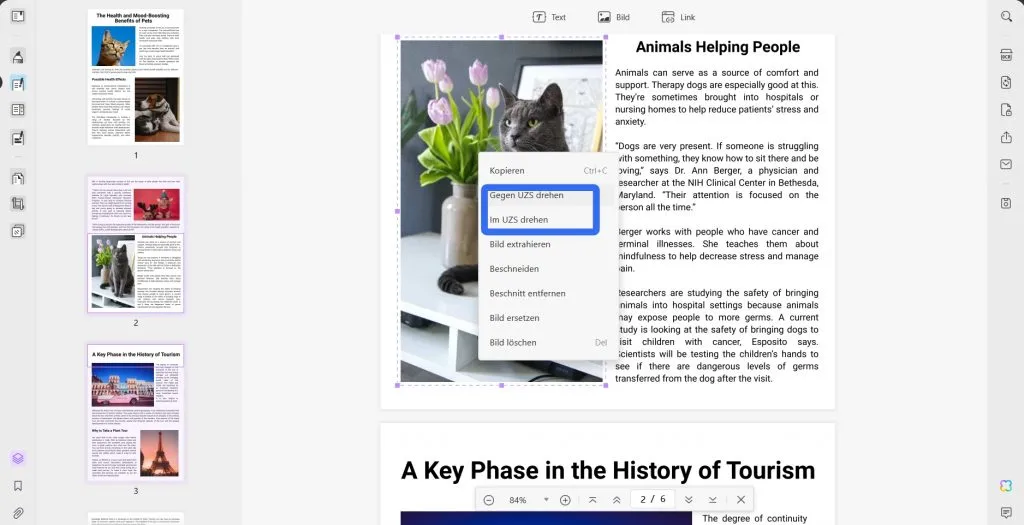 UPDF ist ein umfassendes PDF-Bearbeitungs-Toolkit, mit dem Sie PDFs über eine benutzerfreundliche Oberfläche lesen, beschriften und bearbeiten können. Eine seiner Bearbeitungsfunktionen ist das Spiegeln von Bildern mit nur wenigen einfachen Klicks. Nach Auswahl des Bildes müssen Sie nur noch auswählen, ob Sie es spiegeln, drehen oder zuschneiden möchten. Folgen Sie den nachstehenden Schritten, um Bilder in Word/PDF/PPT-Dateien mit UPDF zu spiegeln: