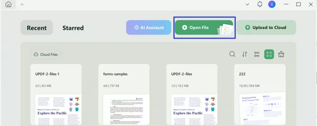 The first step is opening a PDF document that you want to crop. To crop it with UPDF, you must first run the UPDF app on your PC. The easiest method for opening UPDF is by double-clicking the desktop UPDF icon. Then you will use the "Open File" option from the top to open the desired PDF document. Alternatively, you may locate that document in the “Recent” list.
