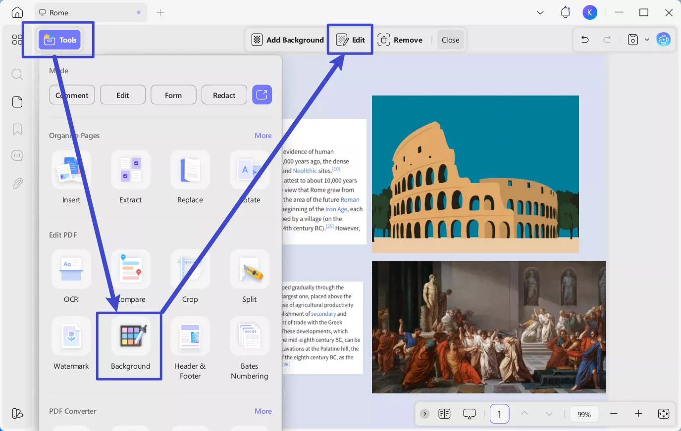 Step 3. After you save the file, UPDF will automatically open the converted document for you. Then, turn to "Edit" mode in "Tools", select the background image, you'll notice that the background can be moved and removed from the new document, and it is now fully editable.